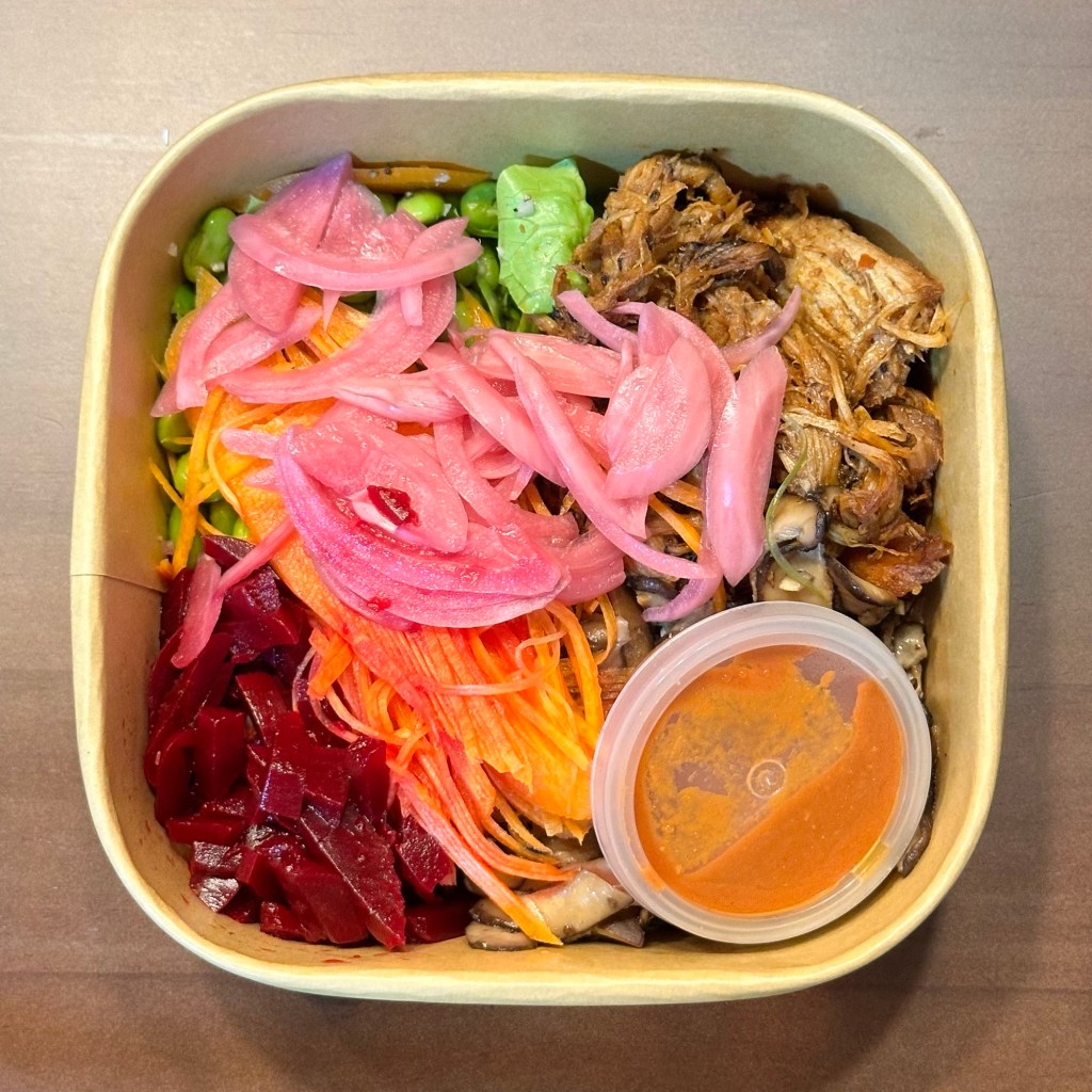 Not many salad places offer pork as an option, possibly because it’s difficult to perfect. Lean pork can become tough, and if seasoned incorrectly, it may taste gamey. The slow-cooked BBQ pulled pork from Urban Mix is very tasty and well-seasoned. Moreover, it’s not oily (they use lean cuts). I’ve heard their Korean Pork Belly is also delicious, but I haven’t had the chance to try it yet.