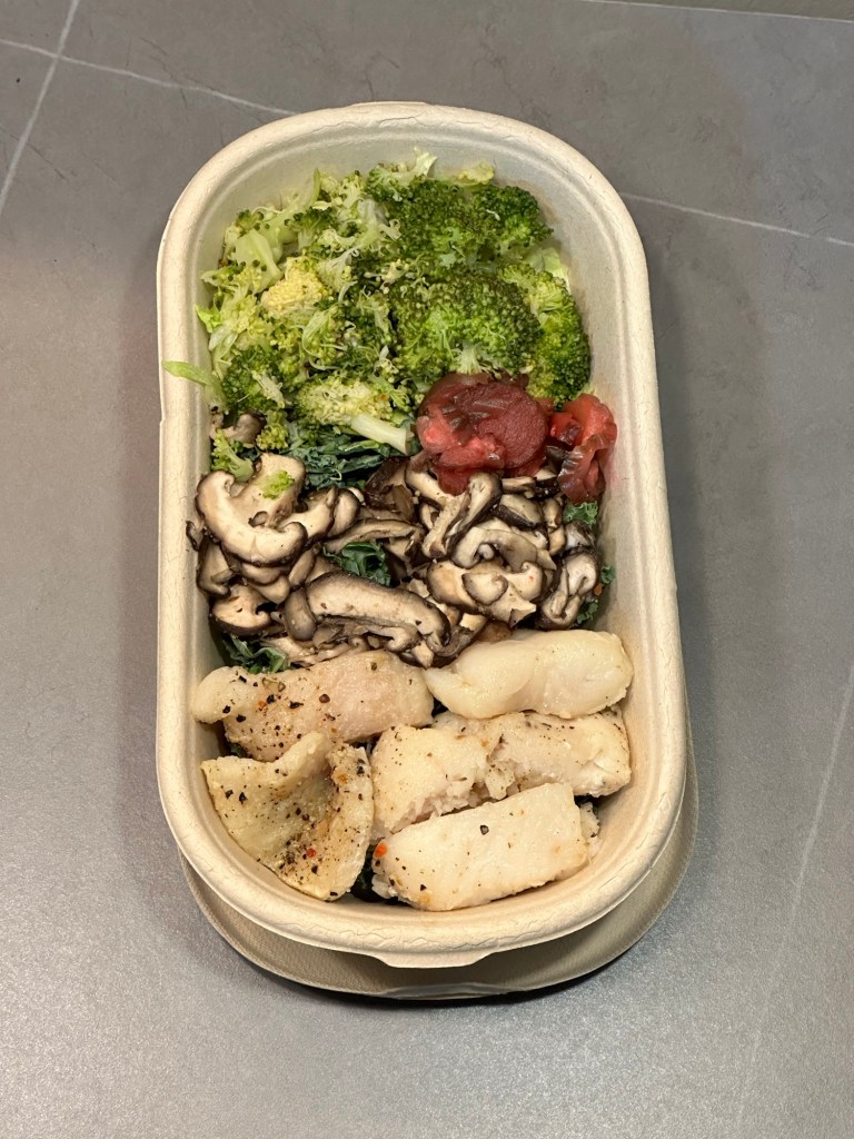 The baked sweet potato lacked texture and was overly moist, characteristics often associated with frozen sweet potatoes. It was the same for the broccoli. The sautéed mushrooms were under-seasoned (tasted like they only added salt, pepper and oil), with a strong ammonia-like aftertaste from the Shiitake mushrooms; a touch of garlic powder could have balanced this better.
