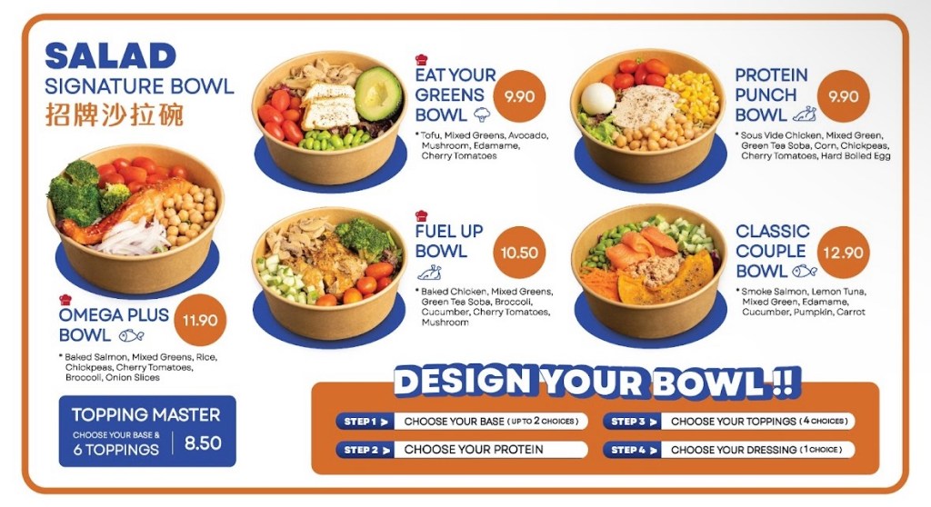 Design Your Bowl ($9.90, 2 base, 4 toppings, 1 protein, 1 dressing)