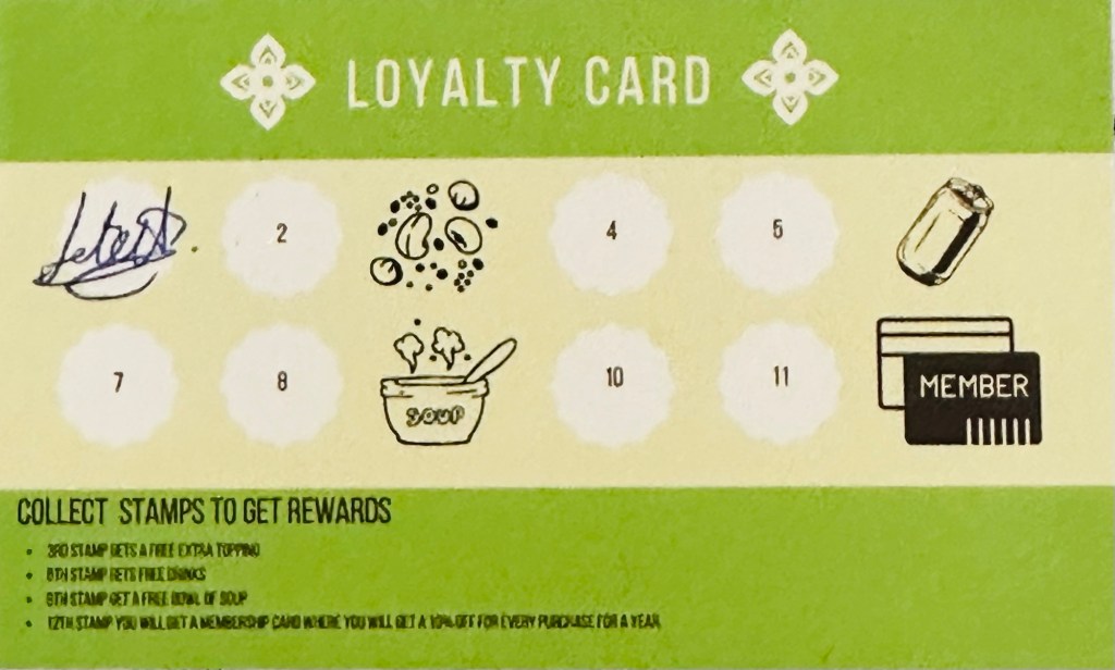Other information/Hacks: Do ask for a loyalty card where you can get a membership card for 10% off your purchases for a year after your 12th bowl.