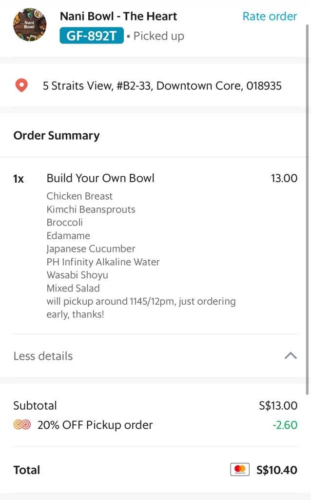Other information/Hacks: Grab Premium’s self pick-up gives you the best offer, allowing you to purchase your bowl for $10.40 instead of $10.90.