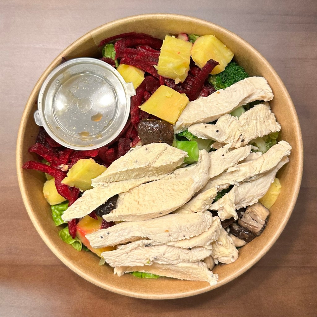Build Your Own Bowl ($10.90, 1 base, 5 toppings, 1 dressing) + Protein ($2)