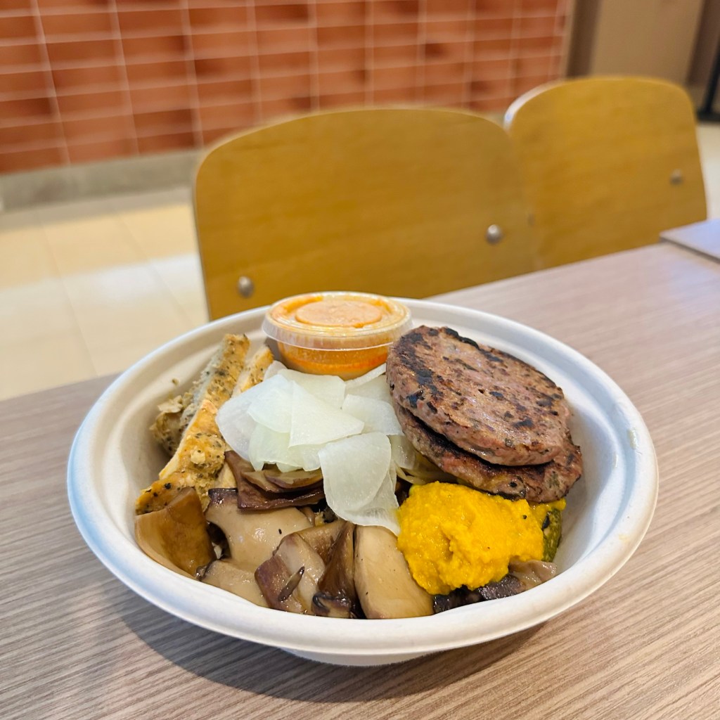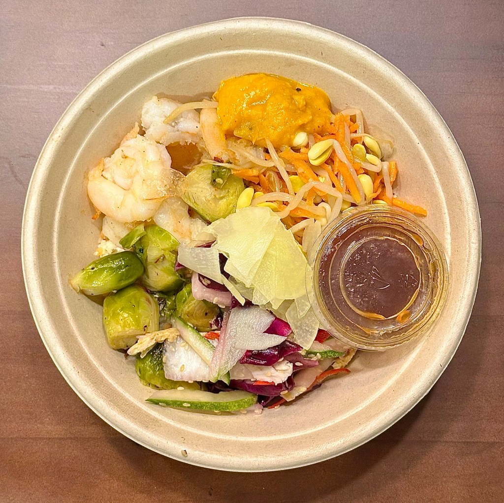 I love to pair it with a pumpkin wedge, Brussels sprouts, their cabbage salad, or sometimes mushrooms. The toppings are perfectly seasoned—just the right amount of flavor without being too salty. I often choose their Yuzu Soy dressing to tie it all together!